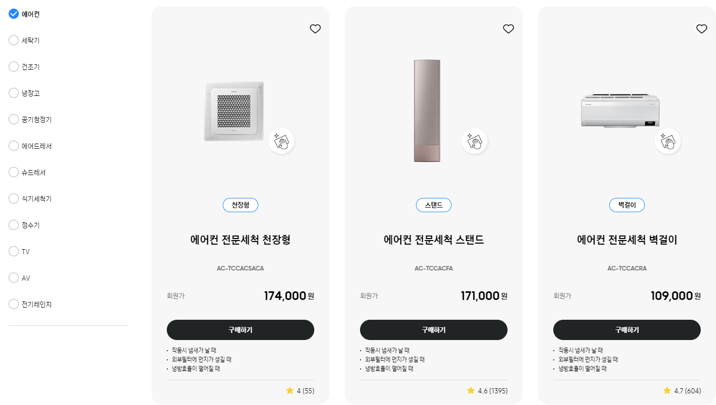 ✅ 천장형 시스템 에어컨은 17.4만원, 스탠드형 17.1만원, 벽걸이 10.9천원이며 1+1(스탠드+벽걸이) 28만원입니다. 순정 서비스를 원하시는 분은 삼성케어플러스를 이용하시기 바랍니다. 아래 바로가기를 통해 삼성 케어플러스 에어컨 세척 신청사이트로 이동 가능합니다.