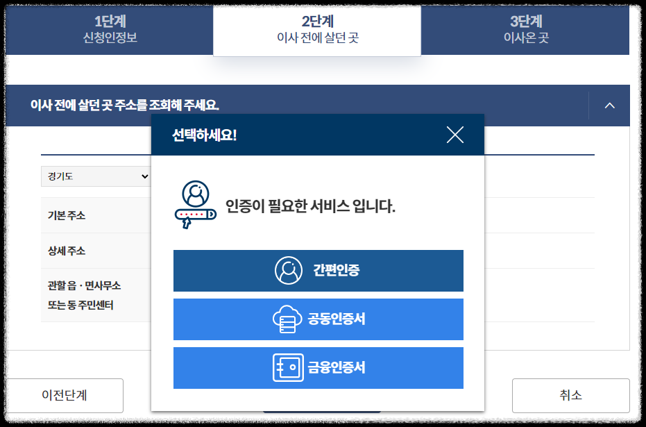 ➡️ 8. 이사 전에 살던 곳에서 주소 검색을 합니다. 여기서 인증이 필요합니다.