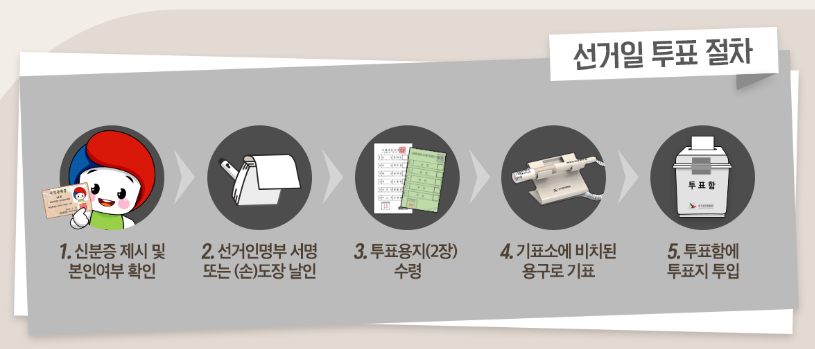 - 기표소에 비치된 용구로 기표 5투표함에 투표지 투입