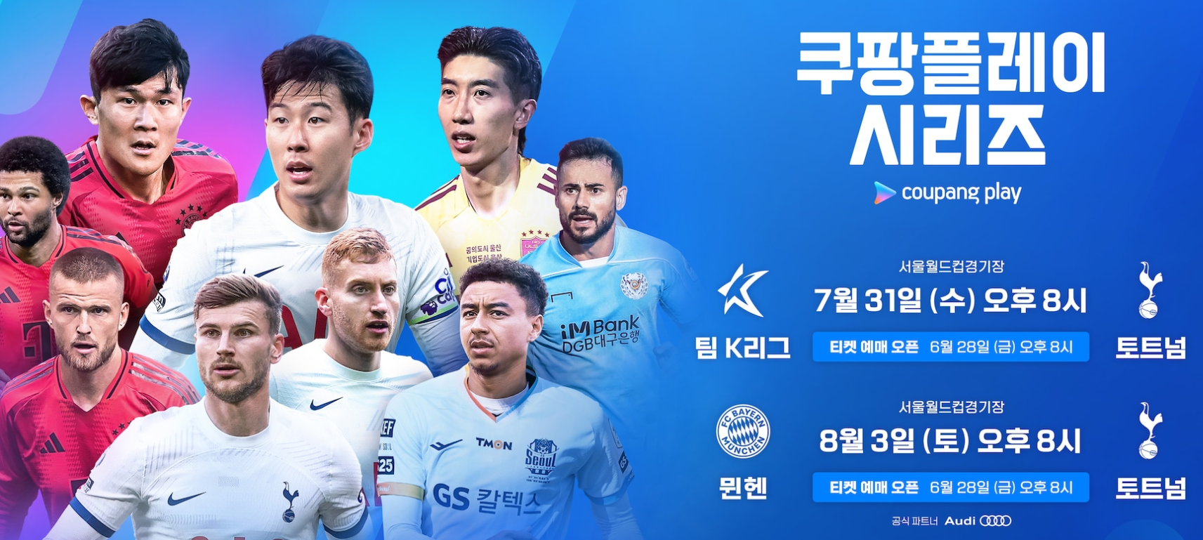 ✅ 오는 8월 3일(20시)에 쿠팡플레이시리즈 첫번째 경기가 펼쳐집니다. 바로 토트넘과 바이에른 뮌헨의 경기인데요. 손흥민, 김민재, 케인 등 슈퍼스타들이 출동해서 한국에서 경기를 펼칩니다.